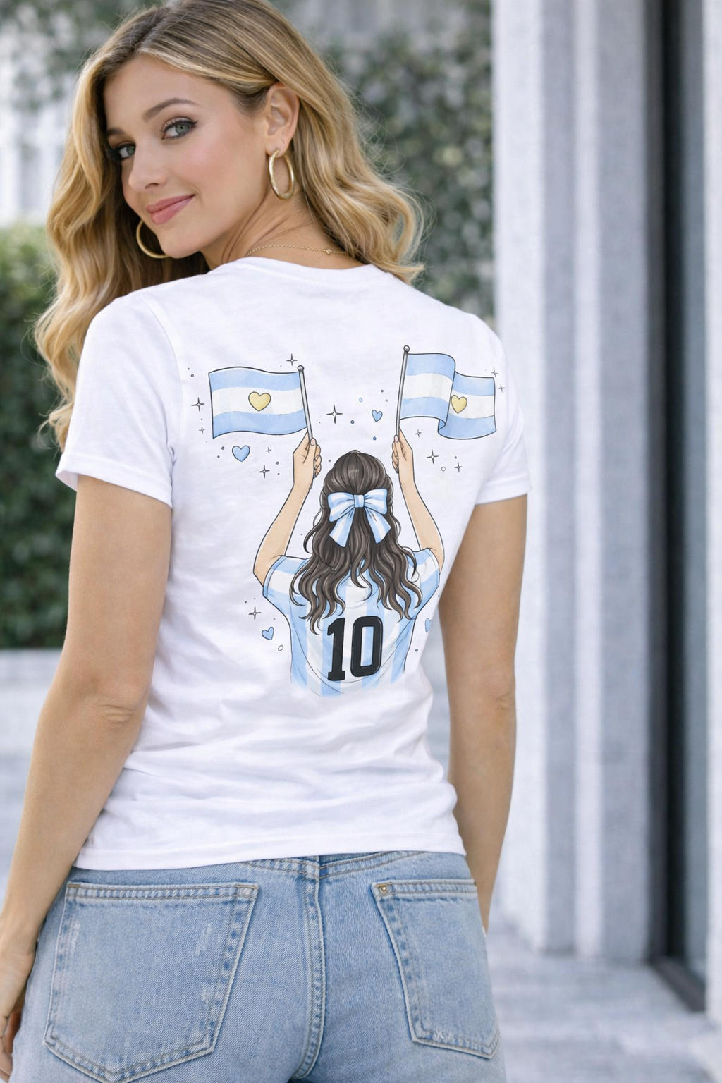Remera femenina blanca con estampa ARGENTINA en tipografía moderna celeste y azul.