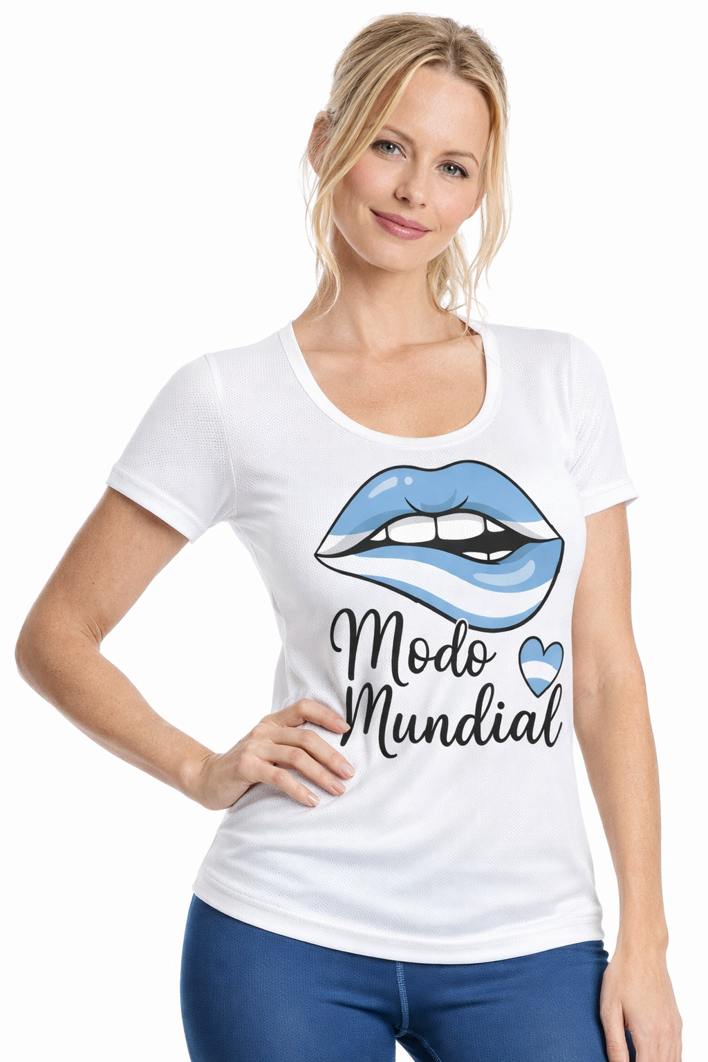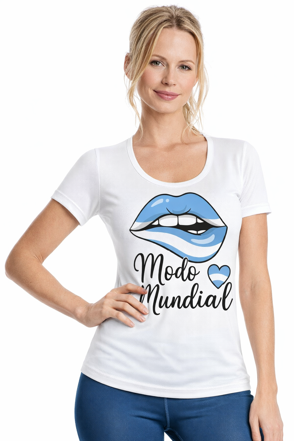 Remera femenina blanca con estampa de labios en celeste y blanco y la frase “Modo Mundial”, un diseño fresco, femenino y súper actual que representa la pasión por el fútbol y el orgullo argentino con un estilo moderno y canchero.